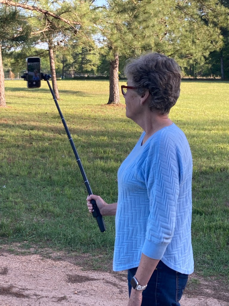 I am 5’9” and have long arms which helps the selfie stick. I video with my right hand and position the slightly above the top of my head which helps with the old lady neck.