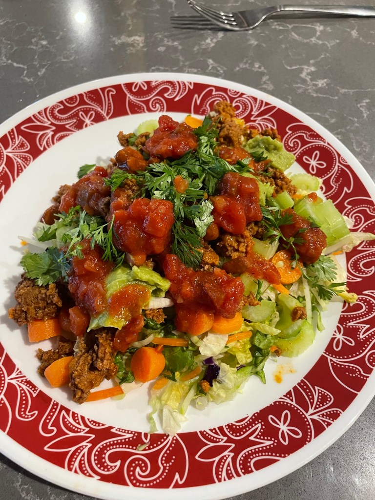 Salad with lettuce, cucumbers… whatever veggies I have in the fridge, canned tuna or chicken, boiled egg whites, with light dressing