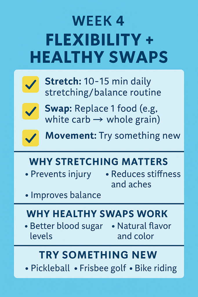 Stretch: Do 10 minutes of daily stretching or a balance routine Swap: Replace one processed food with a more whole version (e.g., white rice → brown rice) Move: Try a new activity — just for fun!