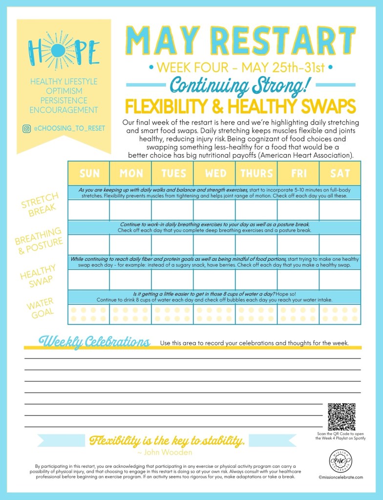Welcome to Week 4 of our May Jumpstart Challenge! You’ve shown up, walked it out, strengthened your posture, and tuned into your portions — now it’s time to stretch your body and your habits. Do I sound cheesy enough for you?